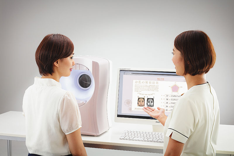 クレンジング・洗顔後、肌解析機でお客様の肌年齢を導き出し現在のお肌の状態をチェックさせていただきます。